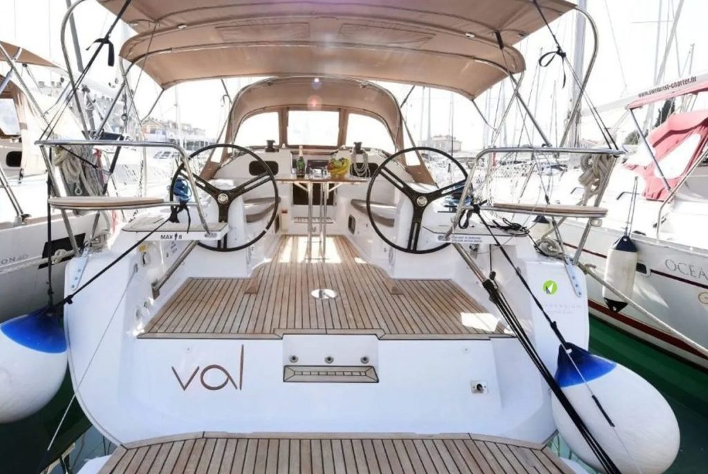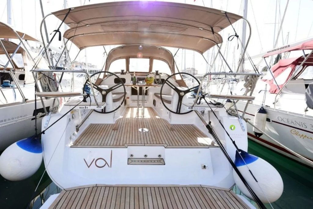 Beautiful Val offers 3 cabins, 8 berths and 2 bathrooms (one with electric toilet). Sleek interior, teak and cushions in a wide cockpit together with a bathing platform insure that Val brings both, comfort and joy of sailing.