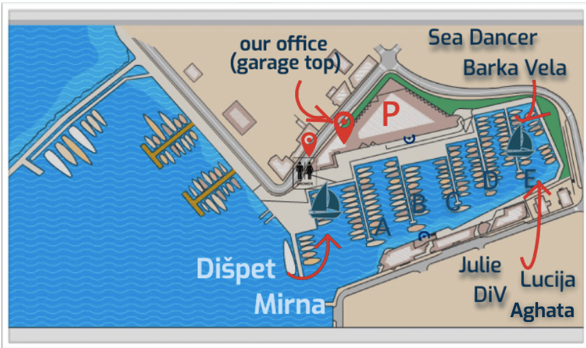 If your boat is moored at pier E, the closest you can drive your car is up till pier D. Call us upon your arrival to the marina and we’ll wait you with the trolley to get your luggage and supplies to the boat.
