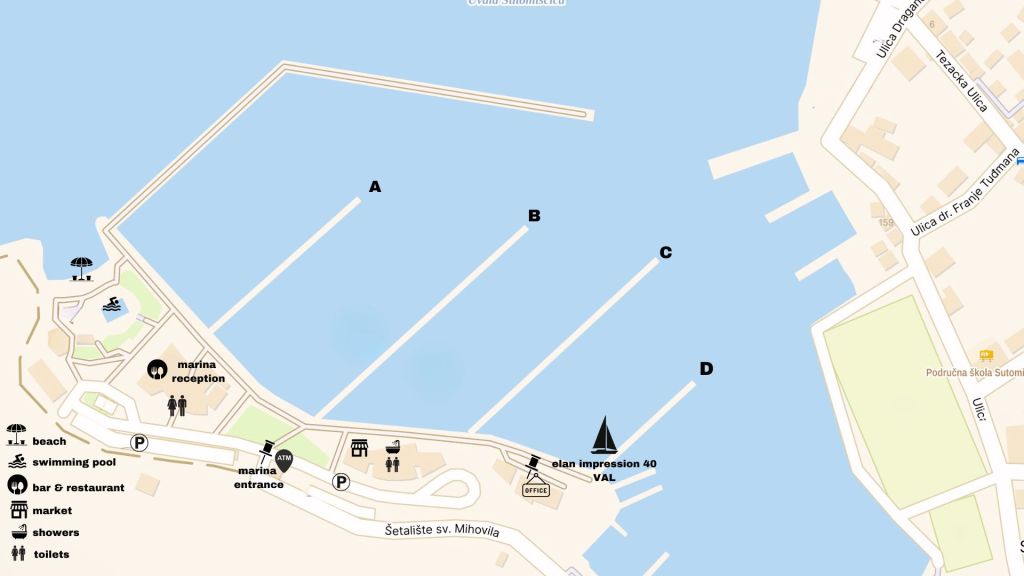 - If you are chartering sailboats Elan Impression 45 Elysium or Bavaria 44 Mirna you can place your car for awhile directly in front of the boat to unload your luggage and supplies, then you can park the car on designated parking areas in the marina (marked places outside, on the rooftop or in the garage)