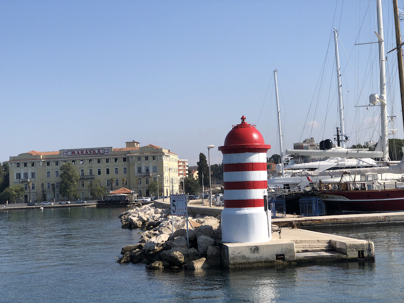 The closest (almost) sandy beach is 30 minutes walk from Marina Zadar, just after you pass Hotel Kolovare and the “swimming pool”.
