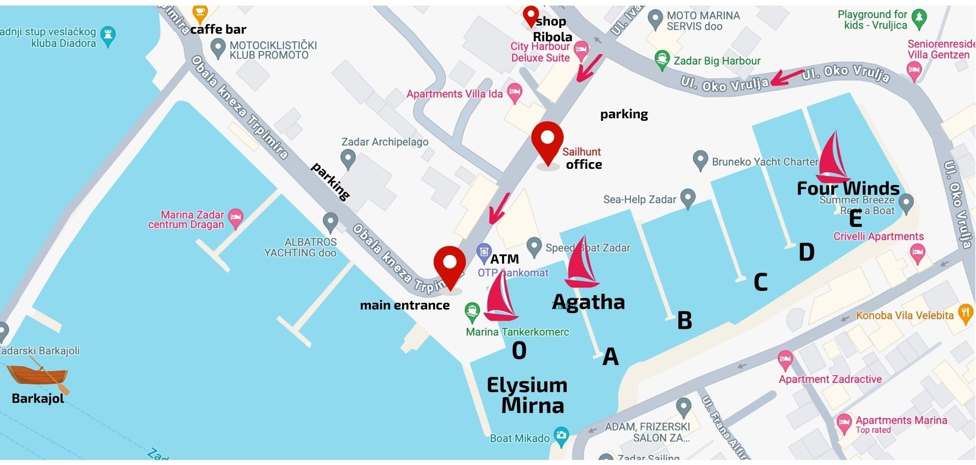 - enter Marina Zadar Tankerkomerc using the main entrance (be careful, the ramp is in the S curve)