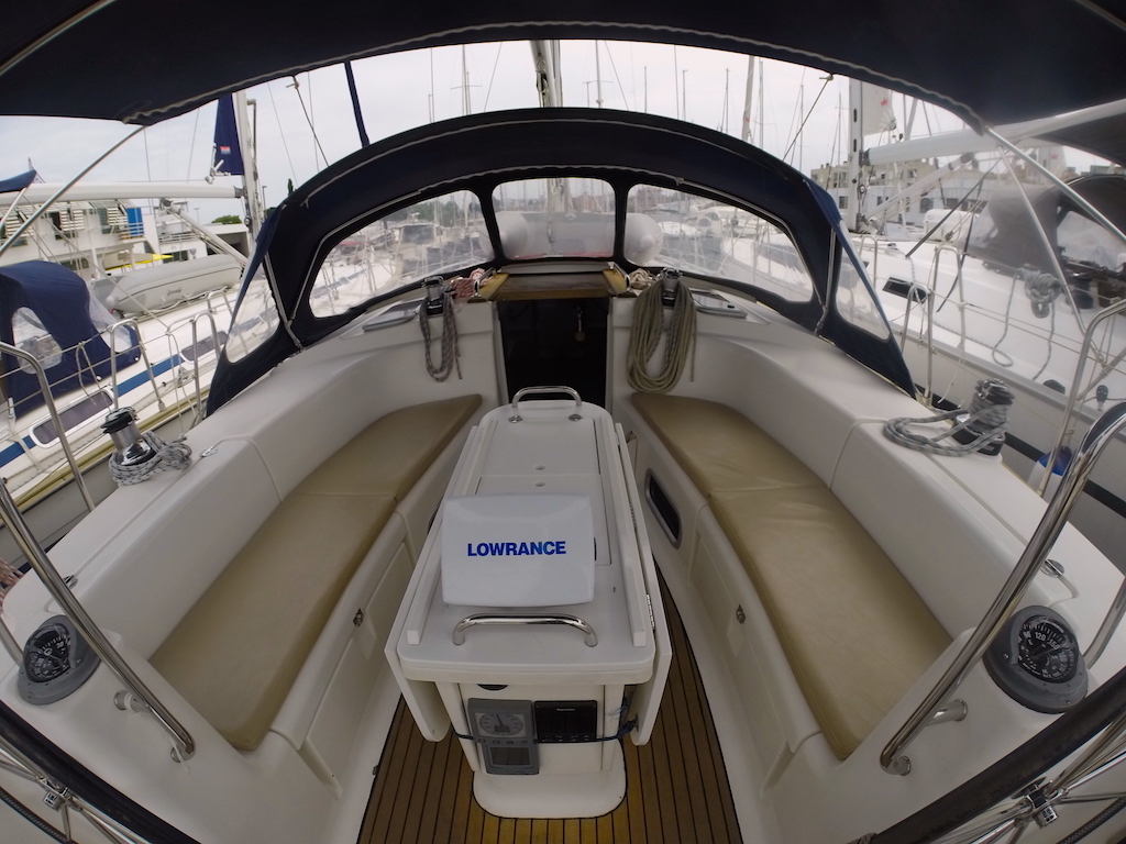 Cockpit is equipped with sprayhood, bimini, cockpit cushions, solar panels and a shower. And for easy maneuvers in the marina you have a bow thruster on board.
