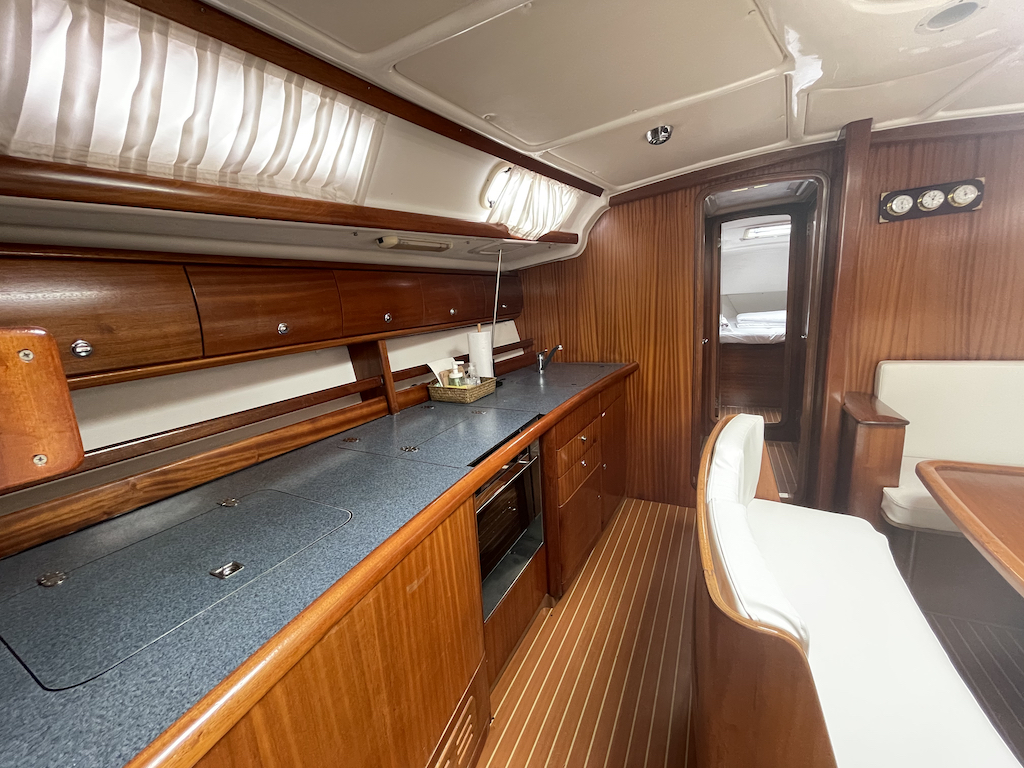 Refit: main sail (2025), A/C (on shore power; 2025), GPS Chart plotter (2024), ropes (2024), bimini (2023), sprayhood (2023), interior carpentry (2022), saloon upholstery (2021), cooker with oven (2020), bow thruster (2020), Genoa (2019), solar panels (2019), dinghy (2018), cockpit cushions (2017)