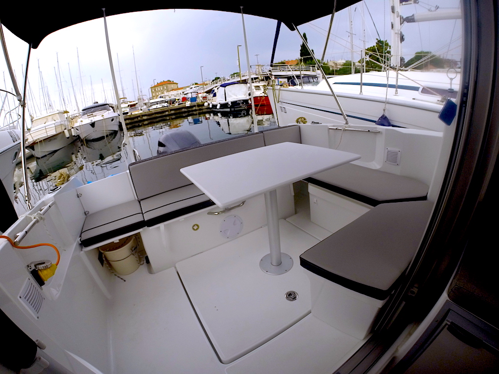 | Cockpit: Bimini, Compass, Cushions, Folding table, Shore power outlet, Shower, Solar panels, Steering wheel (1), Swimming ladder Galley: Cooktop (one ring), Cookware, Cutlery, Eco kitchen set, Fridge, Power socket (220V), Sink (2) Cabin: Bed linen, Double bed (2), Pillows & duvets, USB charger Engine: Yamaha F150 DETL Instruments: GPS Chart plotter (Simrad), VHF radio, Speed & Depth probe Bow: Anchor, Anchor chain (50 m), Bow thruster, El. anchor windlass Safety equipment: Fire extinguisher (1), First aid, Automatic self-inflating Life vest (4), Lifebuoy, Ropes, Spare anchor (10 m) Entertainment: CD radio player, Cockpit speakers, USB charger, WiFi modem |