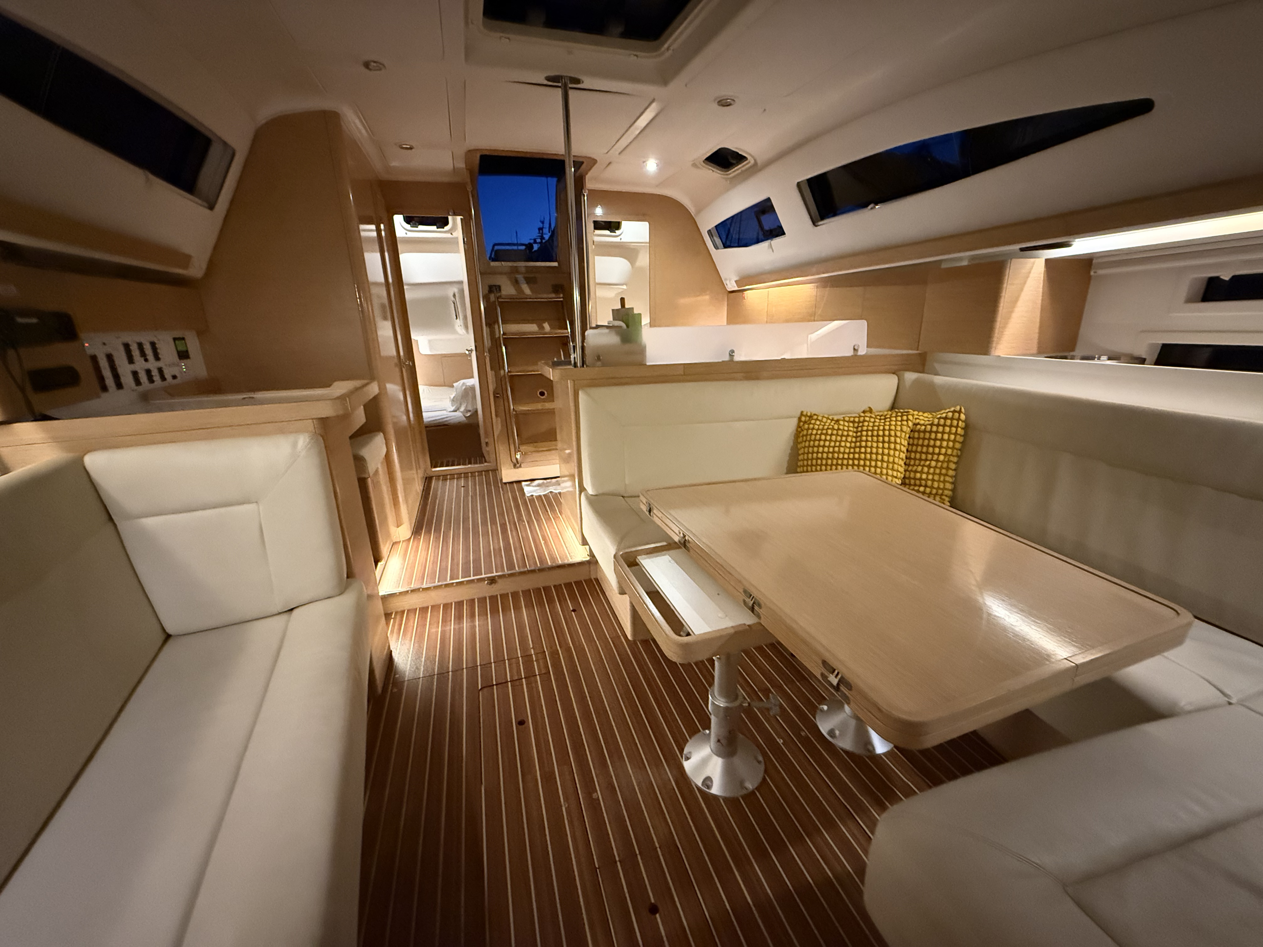 Equipped with four cabins (three double bed cabins & one with bunk beds) and eight to ten berths (folding saloon table makes an extra double bed), including a spacious and tastefully designed interior, this sailboat provides ample space for a comfortable stay. The saloon is adorned with modern amenities and beautifully crafted furnishings, creating an inviting atmosphere for relaxation and socializing. Additionally, the two bathrooms feature toilets and showers (one electric and one manual), ensuring convenience and privacy for all onboard.