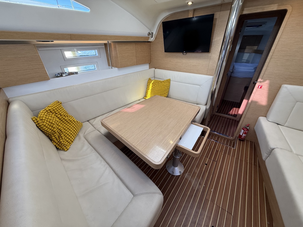| Cockpit: Folding table, Shower, Speakers, Bathing platform, Bimini, Sprayhood, Cushions, Swimming ladder, Shore power outlet, Teak, Steering wheel (2), Dinghy Safety equipment: Life vest (10), Life raft, Spare anchor, First aid, Fire extinguisher (2), Lifebuoy Bow: Bow thruster, Anchor chain (50), El. anchor windlass Refit: Sprayhood (2023), Bimini (2023), Carpentry (Cockpit 2024) Bathroom: Black water tank, Electric toilet Instruments: Autopilot (Raymarine EV 200 SAIL), GPS in cockpit (Raymarine es 75 HYBRID TOUCH), Tri data (Raymarine i70), VHF radio Entertainment: USB charger, Cockpit speakers, WiFi modem Cabin: Bed linen, Pillows & duvets, Heating, Bunk beds (1), Double bed (3) Engine: Volvo 55 HP (VOLVO PENTA D2-55) Galley: Eco kitchen set, Cutlery, Cooker with oven, Microwave, Fridge, Sink (2), Water heater, Table (folding) |